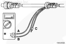 將供電線(觸針 A)和回路線(觸針 B)安裝在萬用表上。電壓測量值應(yīng)在 4.75 VDC 到 5.25 VDC。如果電壓 不在 4.75 VDC 到 5.25 VDC,對發(fā)動機主線束進行故障診斷。參考步驟 019-250 和 019-043。