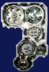 • 剪刀式雙齒輪惰輪消除齒 輪側(cè)隙,減小噪聲