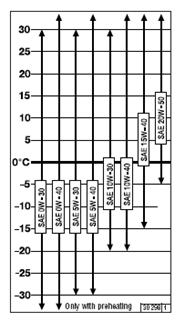 - 機油粘度受溫度影響很大,需要根據(jù)環(huán)境溫度選擇正確的機油粘度,參照右表。(危害)