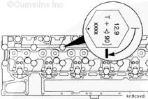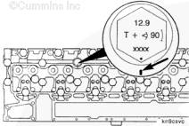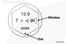 在與螺釘頭部上的小圓點(diǎn)鄰近的缸蓋上做標(biāo)記。此標(biāo)記用來幫助將螺釘擰緊到要求的角度。