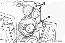 使用千分表測量惰輪 (D) 與軸 (E) 的軸向間隙。