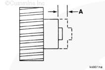 確保齒輪抵著曲軸軸肩入位。使用 0.15 mm [0.0059 in] 塞尺,檢查以了解塞尺是否可以插在曲軸齒輪和曲軸軸肩之間。如果可以插入塞尺,則曲軸齒輪沒有正確座入,必須將其拆卸然后重新安裝。