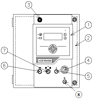 1. 控制器模塊,2. 控制屏外觀,3. 蜂鳴器,4. 緊急停車(chē)按鈕,5. 電壓微調(diào)(額外配套),6. 預(yù)熱控制鍵(額外配套) ,7. 起動(dòng)開(kāi)關(guān),8. 速度微調(diào)(額外配套),