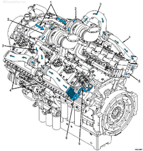 在空氣由渦輪增壓器壓縮后,康明斯K38 和 K50 發(fā)動機利用外置中冷器冷卻空氣。中冷器安裝在進氣歧管中,有一個固定中冷器芯的平板蓋。每個發(fā)動機有 4 個進氣歧管、4 個中冷器芯和 4 個中冷器蓋??諝馔ㄟ^空氣跨接管由渦輪增壓器直接導(dǎo)入中冷器總成。不管有幾個渦輪增壓器,每個發(fā)動機都有兩個空氣跨接管。