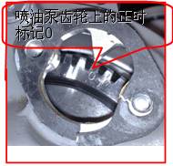 三、完成上一步安裝后,保證曲軸不轉(zhuǎn)動(dòng),再安裝噴油泵,齒輪軸上的標(biāo)記0和指針位置對(duì)齊。