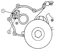 • 順時(shí)針方向轉(zhuǎn)到曲軸,使凸輪軸正時(shí)觀察孔指針①和凸輪軸正時(shí)齒輪標(biāo)記“O”對(duì)齊