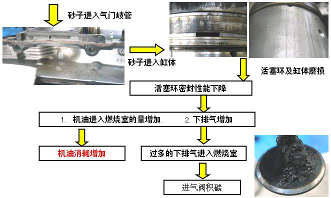 當(dāng)灰塵進(jìn)入發(fā)動(dòng)機(jī)內(nèi)部時(shí),因灰塵中所含沙粒的主要成分SiO2(二氧化硅)的硬度很高,當(dāng)發(fā)動(dòng)機(jī)運(yùn)轉(zhuǎn)時(shí)它起到研磨劑的作用,大大加劇活塞環(huán)等部件的磨損速度。從而造成密封不嚴(yán),使過多的機(jī)油進(jìn)入燃燒室參與燃燒造成機(jī)油消耗量過大。