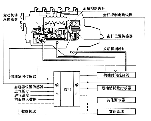 ECU根據(jù)加速踏板位置傳感器信號(即負荷信號)和柴油機轉(zhuǎn)速信號,并參考供油齒條位置、冷卻液溫度、進氣壓力等傳感器信號,按內(nèi)存控制程序計算供油量和噴油提前角控制參數(shù)值,再通過ECU中行程或位置伺服電路,使電子調(diào)速器內(nèi)的線性螺線管控制噴油泵供油齒條的行程或位置。