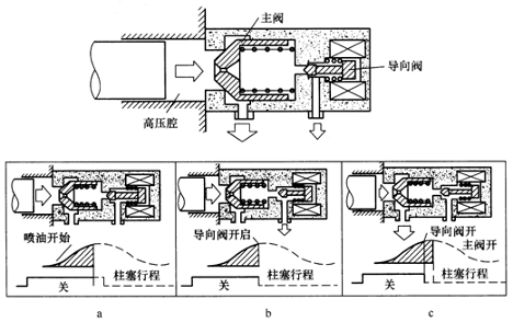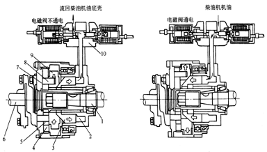 1-凸輪 2-柱塞 3-回位彈簧 4-高壓腔 5-電磁閥針閥 6-電磁閥閥腔 7-進油通道 8-回油通道 9-線圈 10-低壓腔