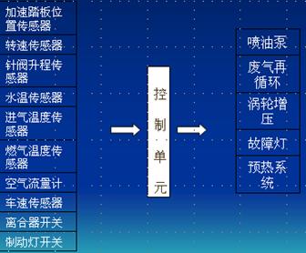 1. 燃油噴射控制 2. 怠速控制 3. 進氣控制 4. 增壓控制 5. 排放控制 6. 起動控制7. 巡航控制 8. 故障自診斷和失效保護9. 柴油機與自動變速器的綜合控制