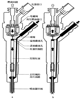 共軌式噴器結(jié)構(gòu)示意圖a 噴油器關(guān)閉狀態(tài) b 噴油器噴射狀態(tài)
