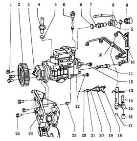 1 – 燃油分配泵驅(qū)動輪固定螺栓 2 – 燃油分配泵驅(qū)動輪 3 – 輪轂螺母 4 – 進油管 5 – 密封環(huán) 6 – 燃油切斷控制閥 7 – 連接管 8– 回油管 9 – 壓緊螺母 10 – 高壓油管 11 – 連接管 12、22 – 螺栓 13 – 噴油器 14 、18 – 緊固螺栓 15 – 支架 16 – 底座 17 – 隔熱密封環(huán) 19 – 噴油正時控制閥 20 – O型環(huán) 21 – 濾網(wǎng) 23 – 軸套 24 – 分配泵支架 25 – 固定螺栓