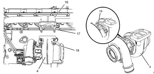 1確保渦輪增壓器(4)清潔、無損壞。檢查渦輪增壓器有無磨損。更多信息請參閱《系統(tǒng)操作、測試和調(diào)整》,“渦輪增壓器檢查”。如果渦輪增壓器的任何零件磨損或損壞,必須更換整個渦輪增壓器。