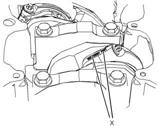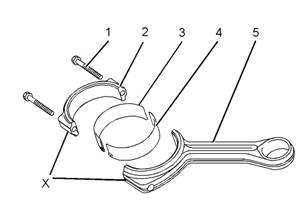 2連桿和連桿蓋在位置(X)中應(yīng)有蝕刻編號。連桿和連桿蓋上的編號必須相互匹配。如有必要,在連桿(5)和連桿蓋(2)上作一個(gè)臨時(shí)標(biāo)記來識(shí)別氣缸編號。