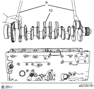 9將工具(A)和適當?shù)钠鸬踉O(shè)備連接到曲軸(10)上。將曲軸(10)吊出缸體。曲軸的重量約為61kg(134lb)。