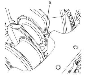 8對于6號主軸瓦,從缸體上卸下兩個止推墊圈(9)。為拆卸止推墊圈(9),朝正確方向轉(zhuǎn)動曲軸。如有必要,轉(zhuǎn)動曲軸時,朝發(fā)動機前端推動曲軸,以便有助于拆卸。如有必要,轉(zhuǎn)動曲軸時,朝發(fā)動機后端推動曲軸,以便有助于拆卸。
