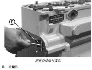 2. 如果需要更換襯套,應(yīng)拆下襯套并測(cè)量汽缸體襯套孔直徑。如果汽缸體上的襯套孔(B) 不符合技術(shù)規(guī)格的要求,應(yīng)根據(jù)需要進(jìn)行維修或更換汽缸體。
