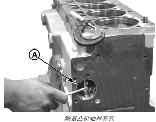 只有前凸輪軸孔的襯套(A) 可以更換。汽缸體中其他凸輪軸孔都起到了凸輪軸襯套的作用。
