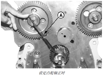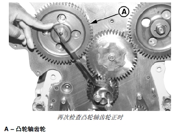 上惰輪帶帽螺釘-扭矩 . . . . . . . . 70 牛頓米(53 磅- 英尺)e. 再次檢查凸輪軸齒輪 (A) 和噴油泵驅(qū)動(dòng)齒輪的正時(shí),確保無誤。