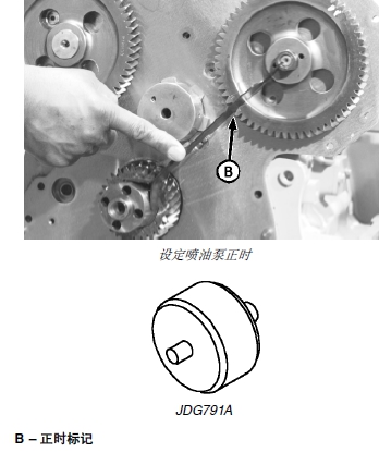 b. 對(duì)于 Stanadyne 老式噴油泵和所有 Delphi/Lucas旋轉(zhuǎn)式噴油泵:JD254A (JD-254A)1 正時(shí)工具放在曲軸軸頭和噴油泵軸中心,檢查噴油泵齒輪正時(shí)。如下表所示,噴油泵驅(qū)動(dòng)齒輪正時(shí)標(biāo)記 (B) 必須與正時(shí)工具(如圖所示)對(duì)齊。