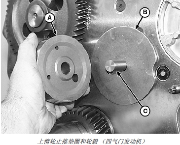 c. 將后止推墊圈 (B) 裝到惰輪銷 (C) 上,潤(rùn)滑槽要正對(duì)惰輪