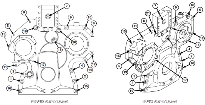 注意: 圖示為雙氣門John Deere約翰迪爾強(qiáng)鹿柴油發(fā)動(dòng)機(jī)。四氣門John Deere約翰迪爾強(qiáng)鹿柴油發(fā)動(dòng)機(jī)的帶帽螺釘和螺栓的安裝方法與之相似。