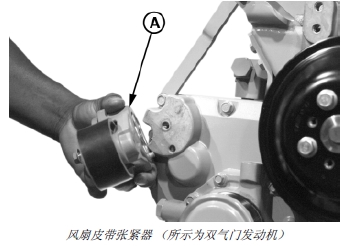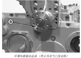9. 安裝可調(diào)風(fēng)扇驅(qū)動(dòng)裝置和風(fēng)扇皮帶輪 (B)。(請(qǐng)參閱第 070 章的“安裝風(fēng)扇驅(qū)動(dòng)總成”部分。)