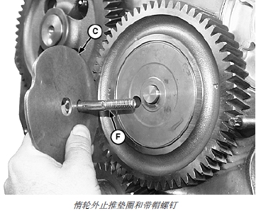 g. 安裝上惰輪前止推墊圈 (C),潤(rùn)滑槽要正對(duì)齒輪。