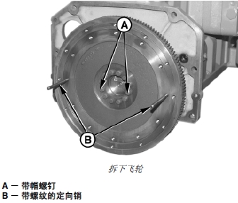 注意: 從發(fā)動(dòng)機(jī)上拆卸飛輪前要先拆卸 SAE 1 飛輪外殼。(參見(jiàn)本章后面的“拆下和安裝飛輪外殼”部分。)