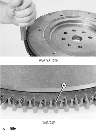 4. 檢查齒圈是否磨損或有壞齒。如果齒圈已毀壞,應(yīng)更換。(參見(jiàn)本章后面的“拆卸和安裝飛輪齒圈”部分。)