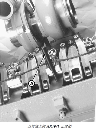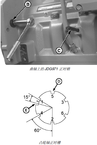 3. 用 JDG820 飛輪旋轉(zhuǎn)工具 (B) 旋轉(zhuǎn)發(fā)動(dòng)機(jī),將凸輪軸鎖定在 1 號(hào)壓縮沖程上止點(diǎn),直到 JDG971 正時(shí)銷(A) 完全嚙合在凸輪軸的正時(shí)槽 (D) 里。旋轉(zhuǎn)發(fā)動(dòng)機(jī)時(shí),通過凸輪軸正時(shí)銷鏜孔觀看凸輪軸正時(shí)凸緣來確定合適的正時(shí)槽。當(dāng)正時(shí)銷插入槽 (D) 時(shí),雙正時(shí)槽(E) 大約在 11 點(diǎn)的位置(從發(fā)動(dòng)機(jī)后面看)。這樣能使發(fā)動(dòng)機(jī)鎖定在 1 號(hào)汽缸壓縮沖程的上止點(diǎn)。一號(hào)汽缸上的進(jìn)氣和排氣搖臂應(yīng)松弛。