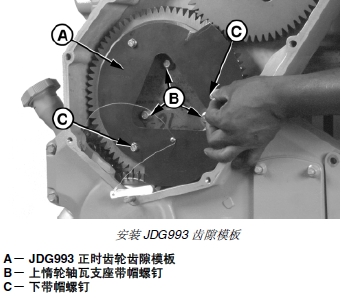 7. 從上惰輪止推盤上卸下下面兩個(gè)帶帽螺釘 (C),如圖所示裝上 JDG993 正時(shí)齒輪輪隙模板 (A)。