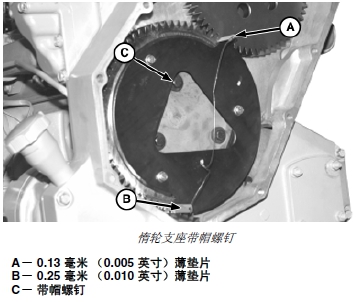 9. 齒輪的重量會(huì)將惰輪和支座總成固定在薄墊片(A 和B)之間,因此兩個(gè)薄墊片繃得很緊,不會(huì)從齒輪齒上掉下來。