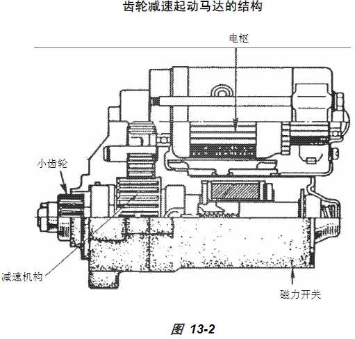 傳統(tǒng)起動馬達(dá)(圖 13-1)有一個同軸的小齒輪和電樞軸。減速起動馬達(dá)有一個不同軸的小齒輪和電樞軸??梢赃x用這兩種類型。減速起動馬達(dá)有一個小型高速馬達(dá),它能把電樞轉(zhuǎn)速降至 1/3 到 1/4 使小齒輪轉(zhuǎn)動。其尺寸比同等輸出的標(biāo)準(zhǔn)起動馬達(dá)小。下圖為一個示例。