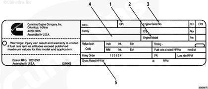 發(fā)動(dòng)機(jī)銘牌顯示有關(guān)發(fā)動(dòng)機(jī)的具體信息。發(fā)動(dòng)機(jī)生產(chǎn)序號(hào)和控制零件目錄 (CPL) 提供了訂購(gòu)零件和維修所需的信息。未經(jīng)康明斯公司批準(zhǔn)不得擅自變更發(fā)動(dòng)機(jī)銘牌。
