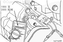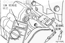 測量觸針 B 與發(fā)動機缸體接地之間的電阻。萬用表 必須顯示開路(10M 歐姆或更多)。