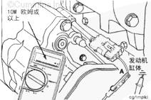 測量觸針 A 與發(fā)動機缸體接地之間的電阻。萬用表 必須顯示開路(10M 歐姆或更多)。