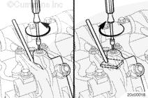 向下壓康明斯發(fā)動(dòng)機(jī)制動(dòng)器搖臂,核實(shí)凸輪軸隨動(dòng)件接觸到凸輪軸。