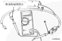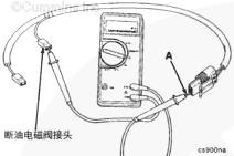 使用萬用表檢查測量組件接頭的端口 A 與燃油泵切斷電磁閥接頭之間的導(dǎo)通性。如果電路開路,更換線束。(技術(shù)規(guī)格 = 小于 10 歐姆)。