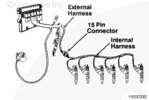 噴油器電磁閥電路包括執(zhí)行器線束電源和回路導線。此導線從 ECM 接頭連到搖臂室殼體中的一個 15-針接頭。15-針接頭連接外部和內(nèi)部的執(zhí)行器線束。內(nèi)部線束連到每個噴油器。有三根導線控制發(fā)動機制動執(zhí)行器電路。